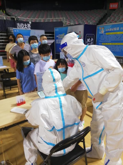 22日傍晚,按照华侨路街道的安排,由仲裁办机关党总支书记顾燕宁带队,13名突击队员来到五台山体育中心核酸检测集中采样点,身穿全副武装的防护服进行现场引导、信息登记等工作直至午夜。队员们两人一组,一人引导10人一组有序进行检测,一人按照信息采集程序逐项录入身份信息,有力确保整个检测井然有序。疫情就是命令,防控就是责任,每名仲裁人都是一道坚固的防线,让党旗高高飘扬在防疫一线。