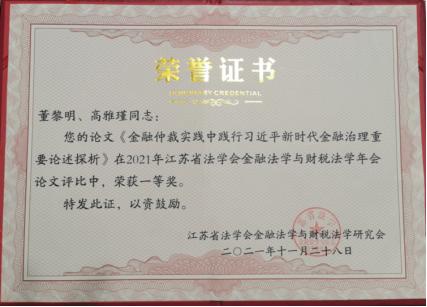 南京仲裁办董黎明、高雅瑾同志撰写的《金融仲裁实践中践行习近平新时代金融治理重要论述探析》一文在2021年江苏省法学会金融法学与财税法学年会论文评比中,荣获一等奖。文章旨在深刻领会习近平新时代金融治理重要论述,充分重视仲裁在金融风险防范与化解中的作用,通过梳理现有实践,对金融仲裁践行习近平新时代金融治理重要论述进行探析,推动金融仲裁在保护市场诚信、规范金融行为、平衡合理利益等方面发挥重要作用,推动金融高质量发展迈上新的台阶。