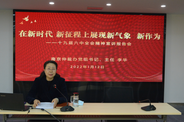 1月12日下午,南京仲裁办组织全体党员干部开展党的十九届六中全会精神专题宣讲报告会。办党组书记、主任李华进行了专题宣讲。宣讲会上,李华主任就深刻认识总结党的百年奋斗重大成就和历史经验的重大意义,深刻认识党的百年奋斗的初心使命和重大成就,深刻认识中国特色社会主义进入新时代的历史性成就和历史性变革,深刻认识党的百年奋斗的历史意义和历史经验,深刻认识以史为鉴、开创未来的重要要求,从党的百年奋斗历程中汲取智慧和力量六个方面,对六中全会精神作了宣讲解读。会议还传达了省市党代会精神。