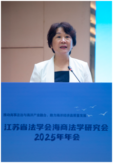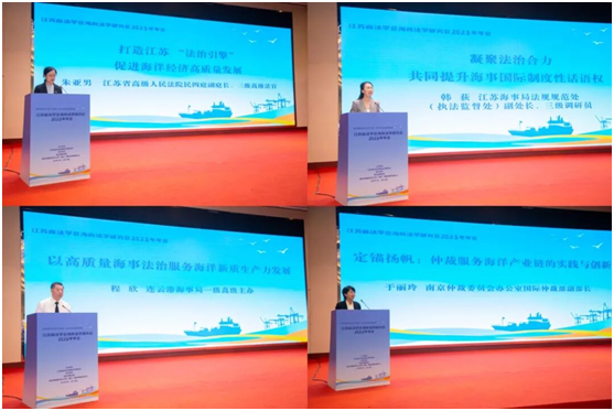 江苏省高级人民法院民四庭副庭长、三级高级法官朱亚男,连云港海事局一级高级主办程欣,江苏海事局法规规范处(执法监督处)副处长、三级调研员韩荻,南京仲裁委员会办公室国际仲裁部副部长于丽玲,分别就《海商法》修改中的船货双方期待与立法考量;海事临时仲裁法律制度的完善;打造江苏“法治引擎”,促进海洋经济高质量发展;以高质量海事法治服务海洋新质生产力发展;凝聚法治合力,共同提升海事国际制度性话语权;定锚扬帆:仲裁服务海洋产业链的实践与创新作主旨报告。