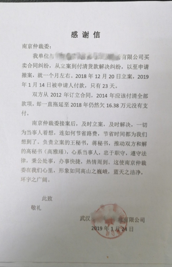春节前,南京仲裁委收到武汉某制造有限公司一封感谢信,感谢南京仲裁委工作人员心系当事人,热情高效解决纠纷。