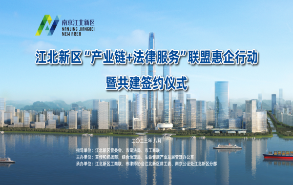 会上,江北新区综合治理局分管负责同志宣读了《江北新区“3+3+X”产业链法律服务惠企行动实施意见》。中国(江苏)自贸区仲裁院、江北新区司法行政系统、工商联系统及各产业平台与新区律工委、相关法律服务平台进行了“产业链+法律服务”联盟共建签约,各单位针对新区实际,制定发布了“产业链+法律服务”产品。