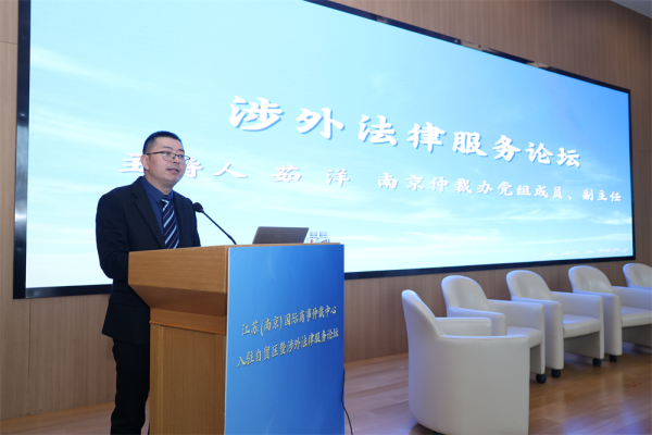 涉外法律服务论坛由南京仲裁委员会办公室党组成员、副主任茹洋主持。