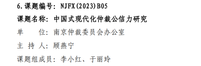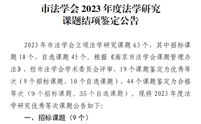 近日,南京市法学会公布2023年度法学研究课题结项结果,经市法学会学术委员会评审,19个课题鉴定为优秀等次,44个课题鉴定为合格等次。其中,南京仲裁委员会办公室课题《中国式现代化仲裁公信力研究》被评为优秀课题。