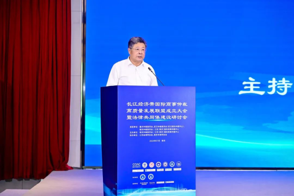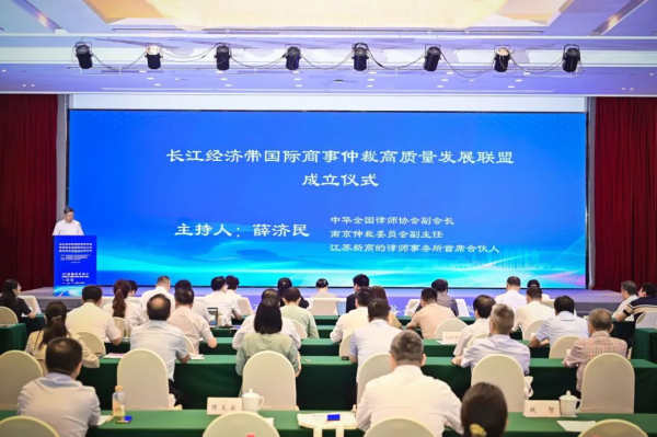 长江经济带国际商事仲裁高质量发展联盟成立仪式,由中华全国律师协会副会长、南京仲裁委员会副主任、江苏新高的律师事务所首席合伙人薛济民主持。