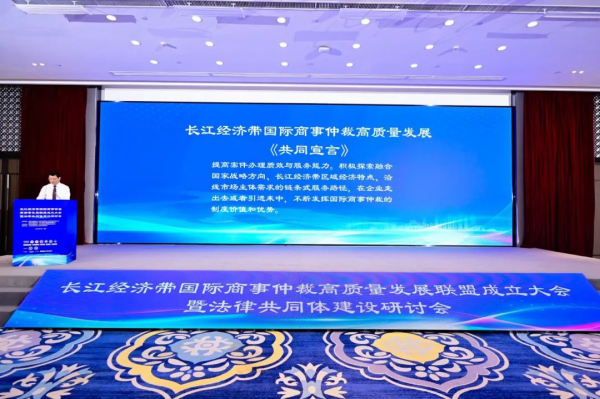 重庆仲裁委员会副主任齐文代表联盟成员宣读长江经济带国际商事仲裁高质量发展《共同宣言》。